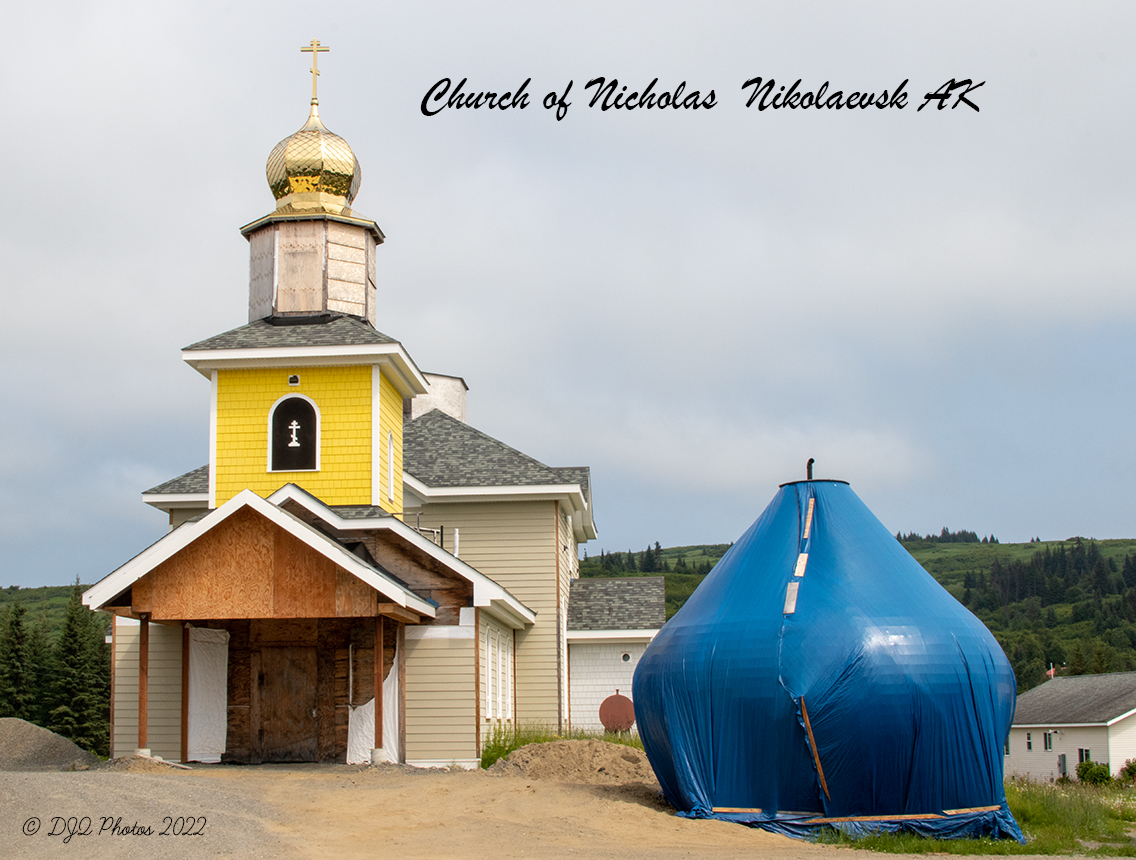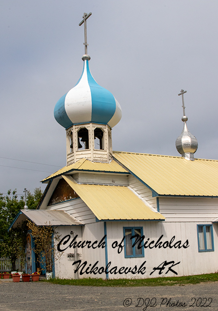 After not wanting to wait for the construction we stopped for a coffee in one of those non-Starbucks drive through coffee huts. Saw there was a pizza place in the same parking lot. So we got a fresh made slice (1/4 of a large pizza). Roy and I split one slice. It was good and even had glazed garlic butter on the crust. Then, we travelled ten miles down a paved road in Anchor Point Alaska and found the village of Nikolaevsk Alaska.