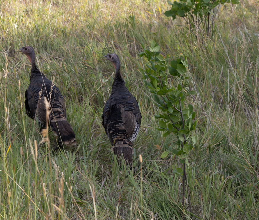 The turkey however is not who or what you think. Roy is a turkey yes, but he is not a wild one. On one of our last days in South Dakota we decided to do the wildlife loop one more time. Roy and I were talking about how we had not seen any turkeys this year. Someone had to be listening because just about then on the side of the road we saw turkeys. We were able to follow their journey in the brush for a couple of hundred yards.