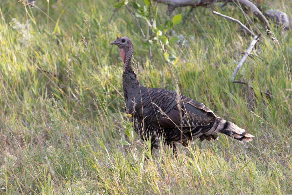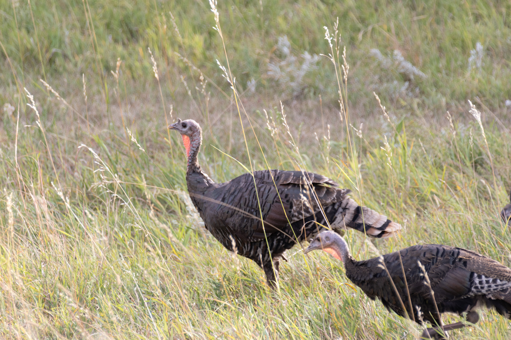 The turkey however is not who or what you think. Roy is a turkey yes, but he is not a wild one. On one of our last days in South Dakota we decided to do the wildlife loop one more time. Roy and I were talking about how we had not seen any turkeys this year. Someone had to be listening because just about then on the side of the road we saw turkeys. We were able to follow their journey in the brush for a couple of hundred yards.