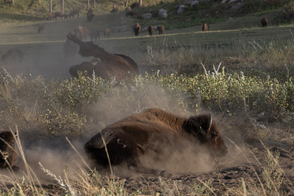 Seeing the interaction between mom and calf and how it changed over the summer. The powerful image of a male standing firm and tall. I felt blessed and lucky to be able to take photographs this particular night because it seemed like everything came together. The rain had finally stopped so when a buffalo would lay in a ‘mud’ hole you wondered where Pigpen was from Charlie Brown.