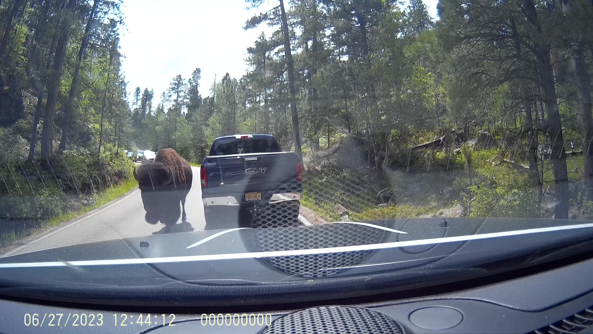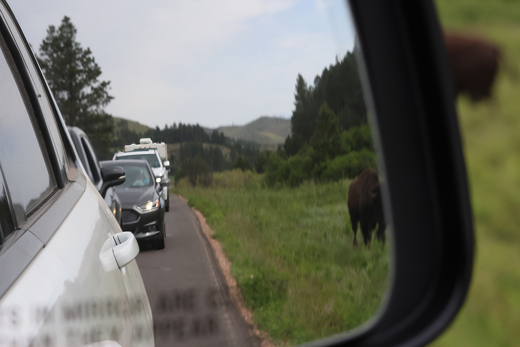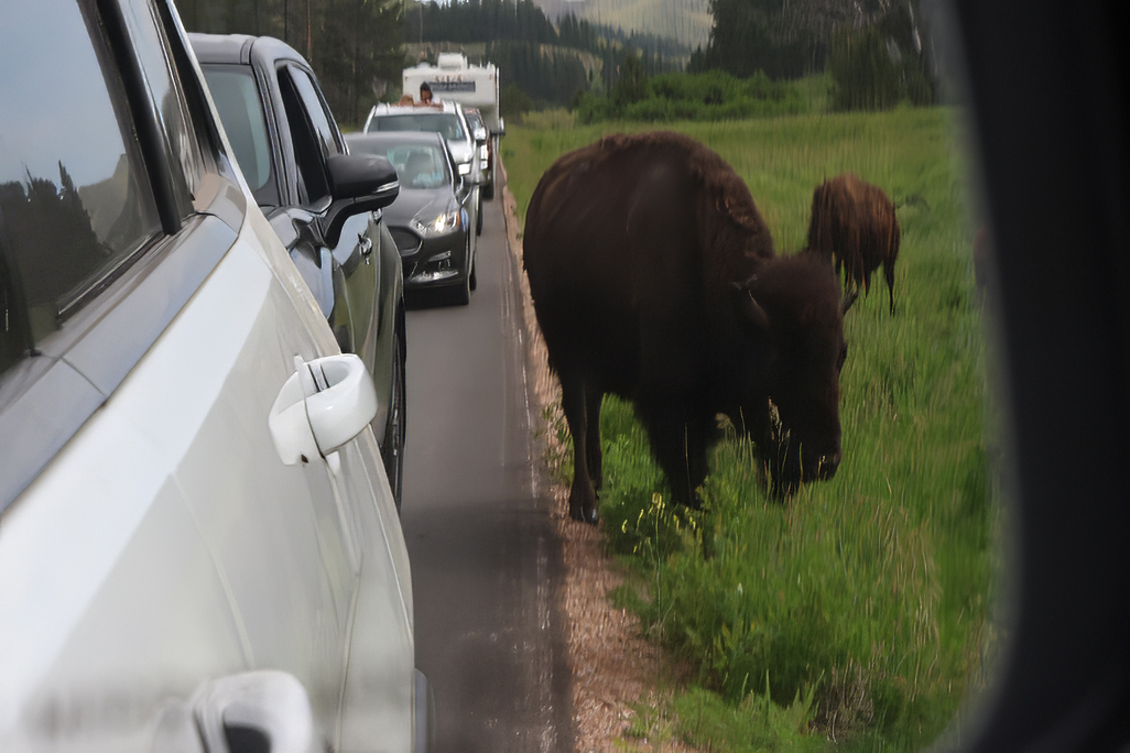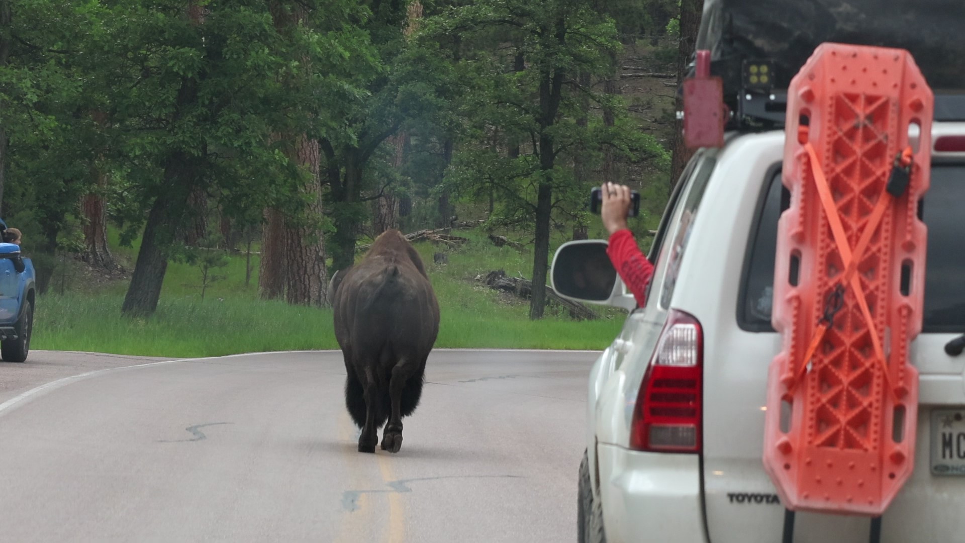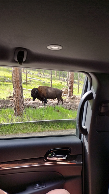 At the other end of wildlife loop rd. where we hadn’t seen buffalo this year, there they were. I think this Sunday drive was a drive full of oddities. We were near the middle of the line of cars waiting to move ahead and get around the buffalo. We had been waiting awhile with no movement in sight, it was then we saw what we thought at the time to be stupid people trying to get selfies. This was not the case.