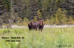 Remember though we did see the bull moose on the other side of the road. He was just standing there no care in the world. I’m thinking he was thinking they are too far away and can’t take my picture. (These paranoid thoughts are happening because lately every moose we see we can’t get a good photo of.) Back to the story. Roy sees a road where we can get closer, and I can use my camera from the car. After going down a near (dirt) road we cross the road that can get us close to the moose. I first try shooting with the 300mm close, but I think I can do better so, I brought out the big guns. Here are the photos side by. side. I did not realize the big difference until I saw the photos side by side.