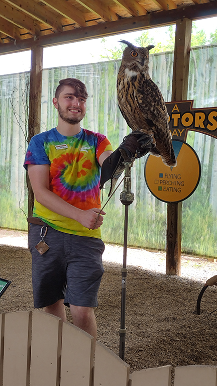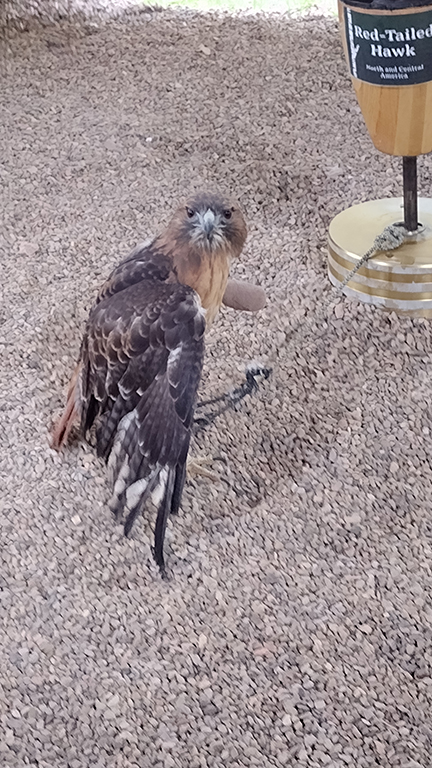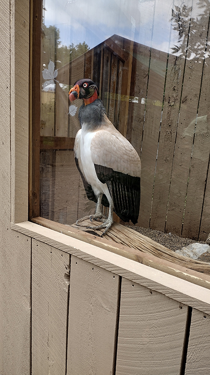 From here it was off to the birds, I have gotten better about being fearful of birds. I still keep my distance though. They had the usual vultures, hawks, owls, and parrots. The red tail hawk was missing part of her wing. The most interesting bird of all was a king vulture Roy was interacting with it by making eye contact and having the bird follow his movements. I myself was just glad he was behind glass.