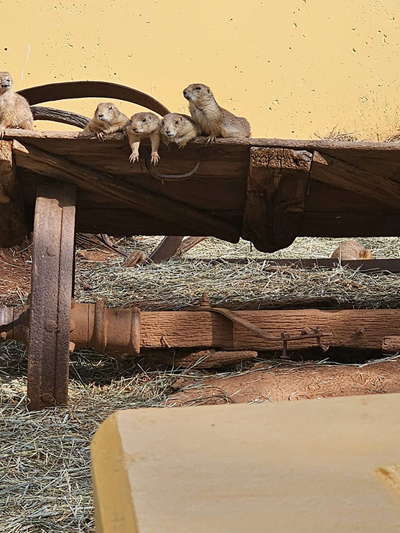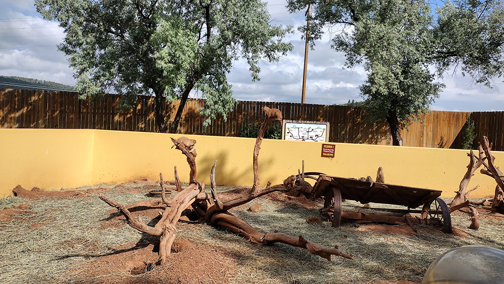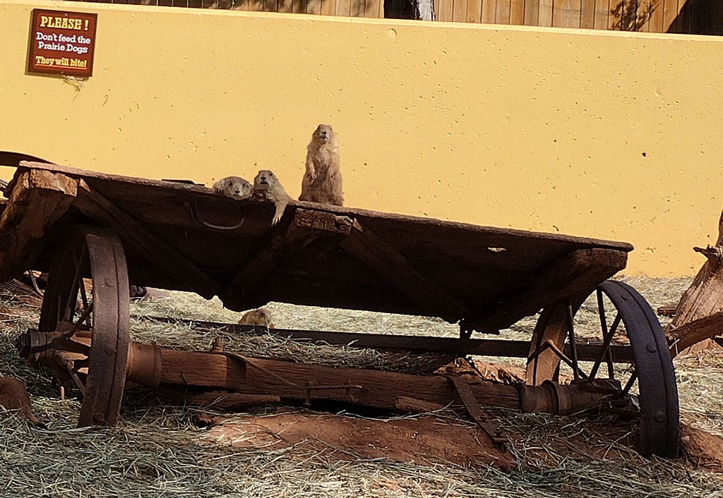 After Roy got loose, we left our tortoise friends behind and headed over to the prairie dog town. This is where Candi decided to get up-close to a prairie dog. She popped up in an observation bubble and even had a dog come inspect her. I have never seen so many slow-moving prairie dogs. I think, in captivity they don’t have to worry much about predators. Candi caught a picture of four of them just being stationary on a piece of wood. I thought they were either dead or stuffed until one did move.