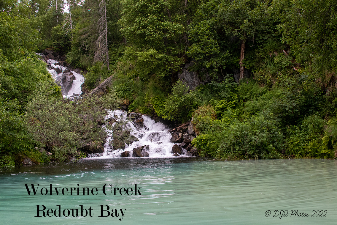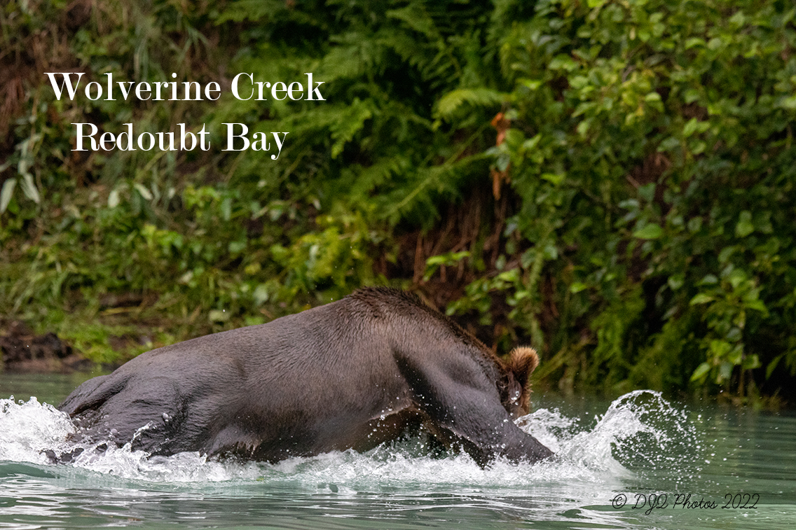 Wolverine Creek/Redoubt Bay is on Big River Lakes, here is a description of the area we were at. We head directly to the base of Wolverine Creek and experienced a small version of combat fishing. I mean there had to be at least ten skiffs in this small area most were fishing. I caught some of their lines in my pictures which was a little annoying, but I was seeing bear. That made it OK.